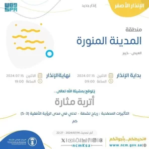 نبه المركز الوطني للأرصاد اليوم من أتربة مثارة على محافظات المهد وخيبر والعيص وينبع ومركز الرايس بمنطقة المدينة المنورة تشمل