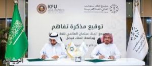وقع مجمع الملك سلمان العالمي للغة العربية مذكرة تفاهم مع جامعة الملك فيصل؛ لأجل تفعيل العمل التكاملي بينهما، والاستفادة من الخبرات والخدمات التي تعزز