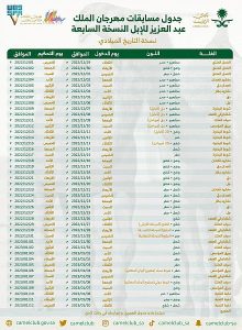 أعلن نادي الإبل اليوم عن جدول مسابقات مهرجان الملك عبدالعزيز للإبل بنسخته السابعة الذي سينطلق مطلع شهر ديسمبر المقبل ويستمر حتى منتصف شهر يناير