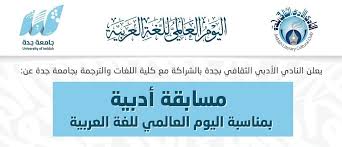 أعلن النادي الأدبي الثقافي بجدة بالشراكة مع كلية اللغات والترجمة بجامعة جدة تنظيم مسابقة أدبية بمناسبة اليوم العالمي للغة العربية, وذلك في أربع فئات تشمل القصيدة, والقصة القصيرة, والمقالة الأدبية, والخاطرة.