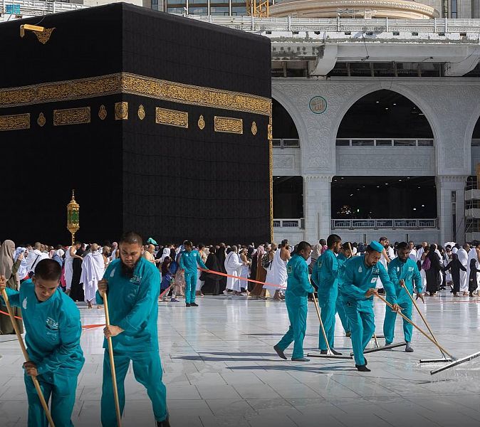 كما قام (200) مشرف للقيام بمراقبة الأعمال الميدانية على (4000) عامل وعاملة، لغسل المسجد الحرام (10) مرات، وتهيئة (7000) عبوة ماء زمزم و(800) عامل لتوزيع الماء المبارك على المصلين والمعتمرين، فيما وُزعت (4500) حافظة ماء زمزم في أرجاء المسجد الحرام، يستهلك من خلالها حوالي (500) ألف لتر.