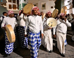 وفي طرقات وشوارع بيوت جدة التاريخية تجوب فرق الفنون الشعبية تردد أهازيج حجازية وفلكلور منوعاً يأتي في مقدمتها الينبعاوي والمزمار والسمسمية والمجس والخبيتي والمجرور لتنقل لهم مزيجاً من الفن العريق والتراث الأصيل الذي كان يدور في أزقة وحارات جدة القديمة.