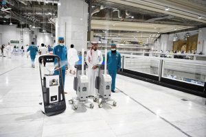 ووفّرت الرئاسة العديد من الروبوتات الذكية التي تقوم على خدمة المصلين والمعتمرين بالمسجد الحرام، منها “روبوت التعقيم” الذي يعمل على تعقيم جنبات المسجد الحرام، بنظام تحكم آلي مبرمج على خريطة مسبقة، وعلى (6) مستويات، مما يحسن سلامة الجو الصحي البيئي وتحليل متطلبات التعقيم بذكاء، وفقاً لسيناريوهات الاستخدام، ومسار التعقيم، والمدة المخططة بشكل مستقل لتغطية كاملة للفضاء البيئي.