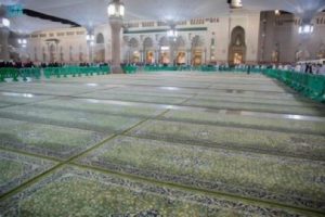 كما يوجد في المسجد النبوي وسطحه وساحاته أكثر من 25 ألف سجادة، تتم العناية بها، ويتم كنس السجاد ثلاث مرات يوميًّا، وتعقيمه بأكثر من 1600 لتر، وتعطيره بأكثر من 200 لتر، وغسل 150 سجادةً يوميًّا لراحة زائري المسجد النبوي.