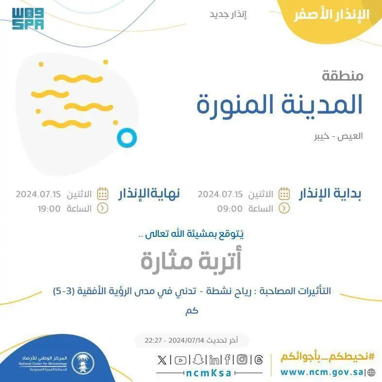نبه المركز الوطني للأرصاد اليوم من أتربة مثارة على محافظات المهد وخيبر والعيص وينبع ومركز الرايس بمنطقة المدينة المنورة تشمل تأثيراتها رياحا نشطة وتدنيا في مدى الرؤية الأفقية( 3-5 ) كم.