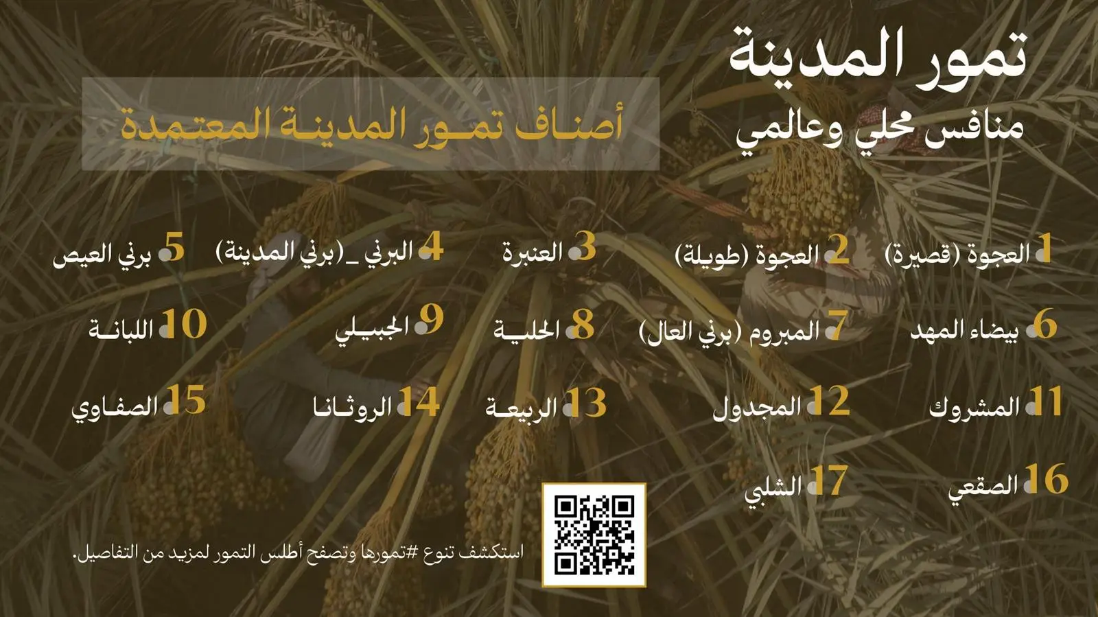 ويتضمن أطلس التمور التعريف بـ (17) صنفًا من تمور منطقة المدينة المنورة وهي العجوة بنوعيها القصير والطويل والعنبرة، والبرني (برني المدينة – برني العيص – برني العلا ) وبيضاء المهد، والمبروم، والحلية، والجبيلي، واللبانة، والمشروك، والمجدول، والربيعة، والروثانة، والصفوي، والشلبي، والصقعي.