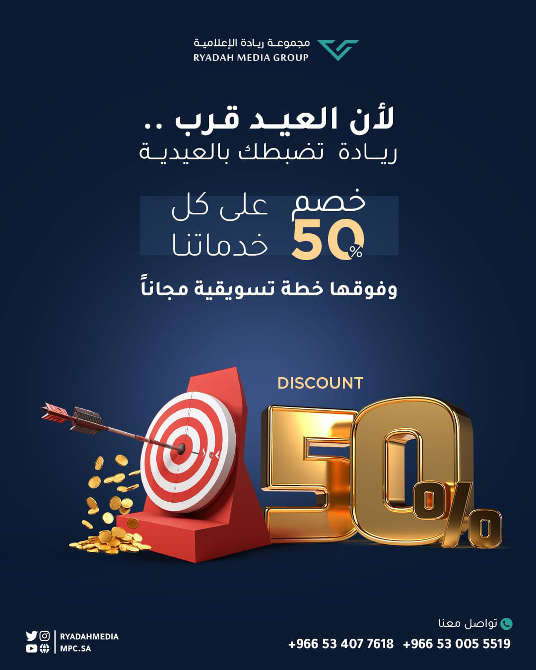 أعلنت مجموعة ريادة الإعلامية عن إطلاق عرضٍ خاص بمناسبة قرب حلول عيد الفطر المبارك، يتضمن خصمًا يصل إلى 50% على جميع الخدمات الإعلامية والتسويقية والإعلانية، وذلك في إطار دعمها للشركات ورواد الأعمال والمؤسسات الراغبة في تعزيز حضورها الإعلامي والتسويقي خلال هذه المناسبة.