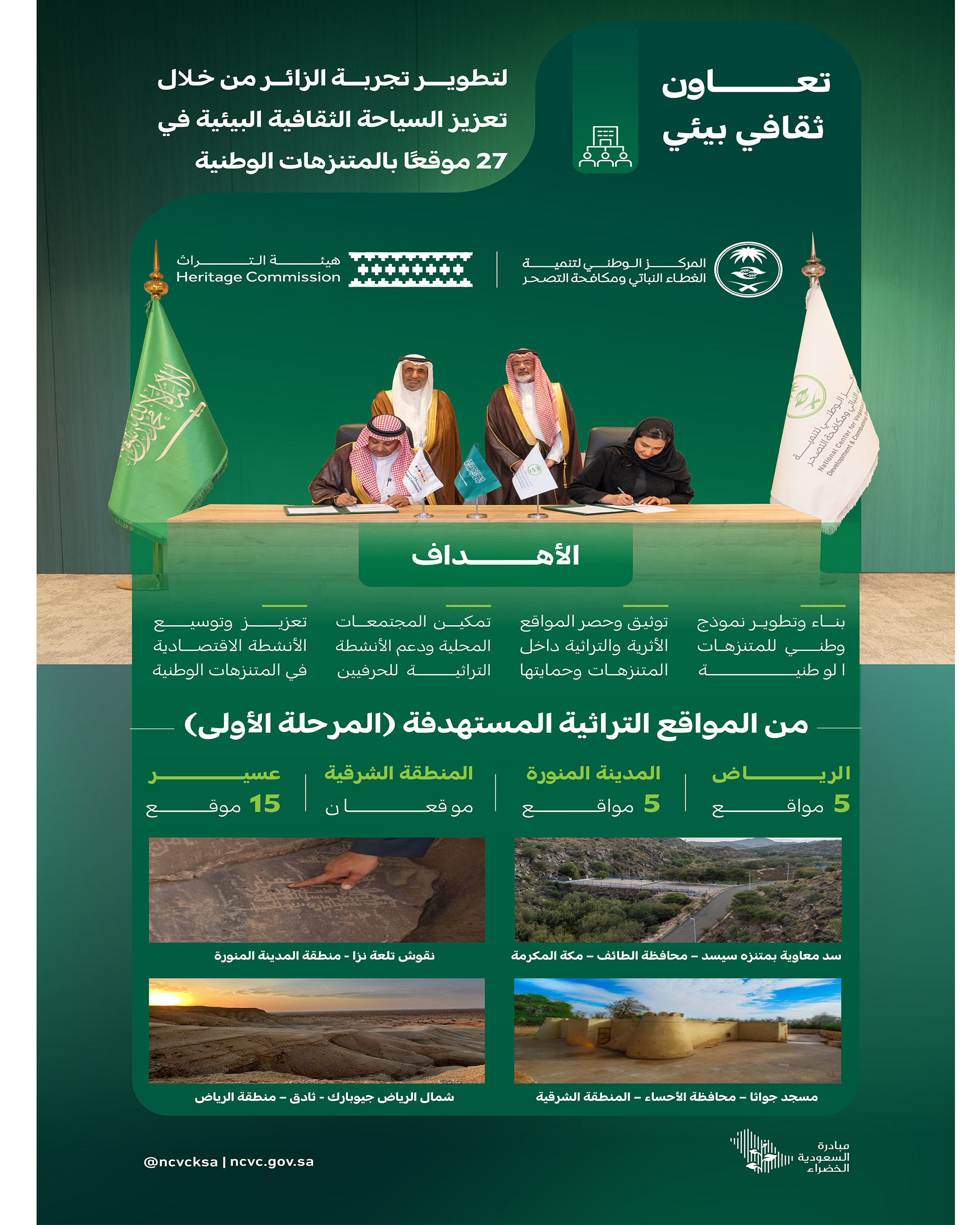 وقّع المركز الوطني لتنمية الغطاء النباتي ومكافحة التصحر، وهيئة التراث مذكرة تعاون، للعمل على ربط الأصول التراثية بالمتنزهات الوطنية، وتحويلها إلى وجهات ثقافية بيئية مستدامة، بما يُسهم في تعزيز السياحة، البيئية الثقافية، ودعم التنمية الاقتصادية، بالإضافة إلى حماية مواقع الآثار والتراث بمختلف مكوناته المادية وغير المادية التي تزخر بها مناطق المملكة، وذلك في 27 موقعًا بالمتنزهات الوطنية خلال المرحلة الأولى في العديد من مناطق المملكة، وإعادة تأهيلها وتحقيق استدامتها، وفقًا لمستهدفات رؤية السعودية 2030.