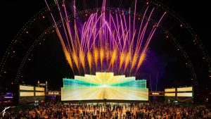 وأمام شاشة عرض يتجاوز حجمها 2160 متراً مربعاً تتوسط منطقة “سيتي ووك”؛ يصطف زوار المنطقة يومياً لمشاهدة العروض المرئية والموسيقية في ساحة كبيرة تستوعب آلاف الزائرين، كما تضم مكبرات صوت ذات جودة ومواصفات عالية تنقل الزائر في تجربة سينمائية مُختلفة.