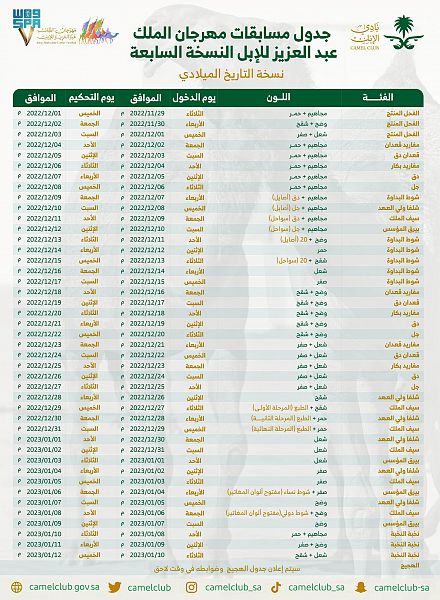 أعلن نادي الإبل اليوم عن جدول مسابقات مهرجان الملك عبدالعزيز للإبل بنسخته السابعة الذي سينطلق مطلع شهر ديسمبر المقبل ويستمر حتى منتصف شهر يناير 2023م.