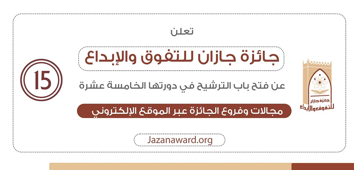 افتتحت جائزة جازان للتفوق والإبداع باب المنافسة والترشيح في دورتها الخامسة عشرة للعام الحالي 1444 هـ، التي توسعت بفرعي مجال الإبداع الأدبي والفني ومجال حماية البيئة دولياً، مما يتيح التقديم لجميع دول مجلس التعاون.