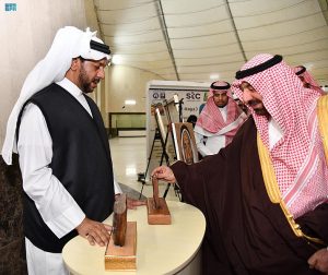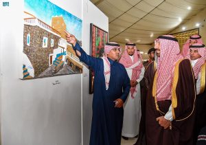 وافتتحَ سموُّه المعارضَ المصاحبةَ للفعاليات، مستمعاً لشرحٍ من رئيس مجلس إدارة الجمعية السعودية للفنون التشكيلية “جسفت” الدكتورة منال الرويشد عن ما تحويه تلك المعارض، التي تشمل معرضاً للتعليم، ومعرضاً للفنون التشكيلية بعنوان “جودة الحياة”، يتضمَّن أكثر من 40 عملاً تشكيلياً لـ 35 فناناً وفنانةً من منطقة نجران ومختلف مناطق المملكة، وكذلك معرضاً للنحت الصخري.